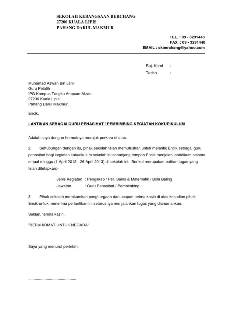 Contoh Surat Perlantikan Jawatan Tugas Sekolah